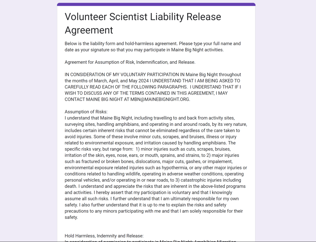 After reading the training handbook and passing the quiz, you must sign the liability waiver. This is also a good time to have anyone else sign the waiver who plans to participate with you as an uncertified volunteer (though remember, they must participate with you – under no circumstances can an uncertified volunteer participate without a certified volunteer with them).